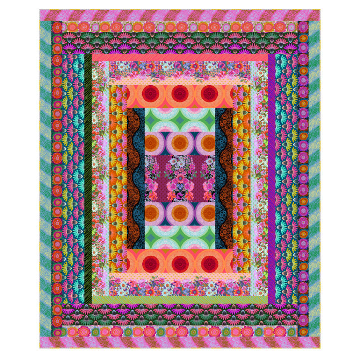 Anna Maria...At first glance this design is practically an oversized Courthouse Step block. However, I broke the Courthouse Step method here and there to grow the quilt from the center to the edges in a less than straightforward order. The result really shows off beautiful border fabrics in a variety of widths and orientations. The focus of this pattern is to teach my favorite method for fabric repeat matching for the pieced borders which will involve a little fussy cutting. The rest of the quilt top is a relaxing and simple joy to sew!